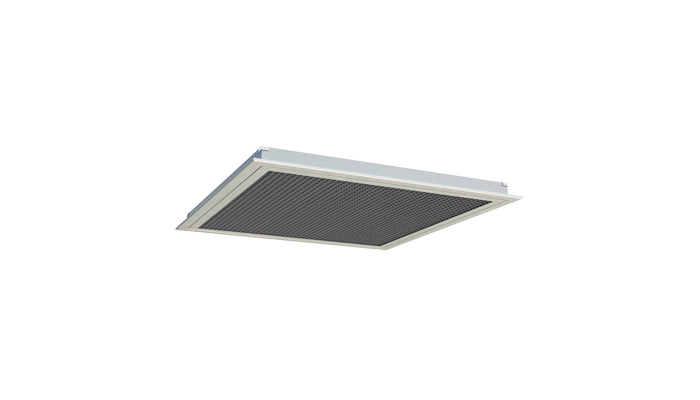 AFC ist in verschiedenen Aluminium-Gitterausführungen verfügbar und speziell für den Einbau in u. a. modularen Deckensystemen konzipiert. Optional Rasterlamellen mit Neigung 0˚ oder 45˚, feststehende, um 45°geneigte Lamellen oder perforierte Frontplatte.